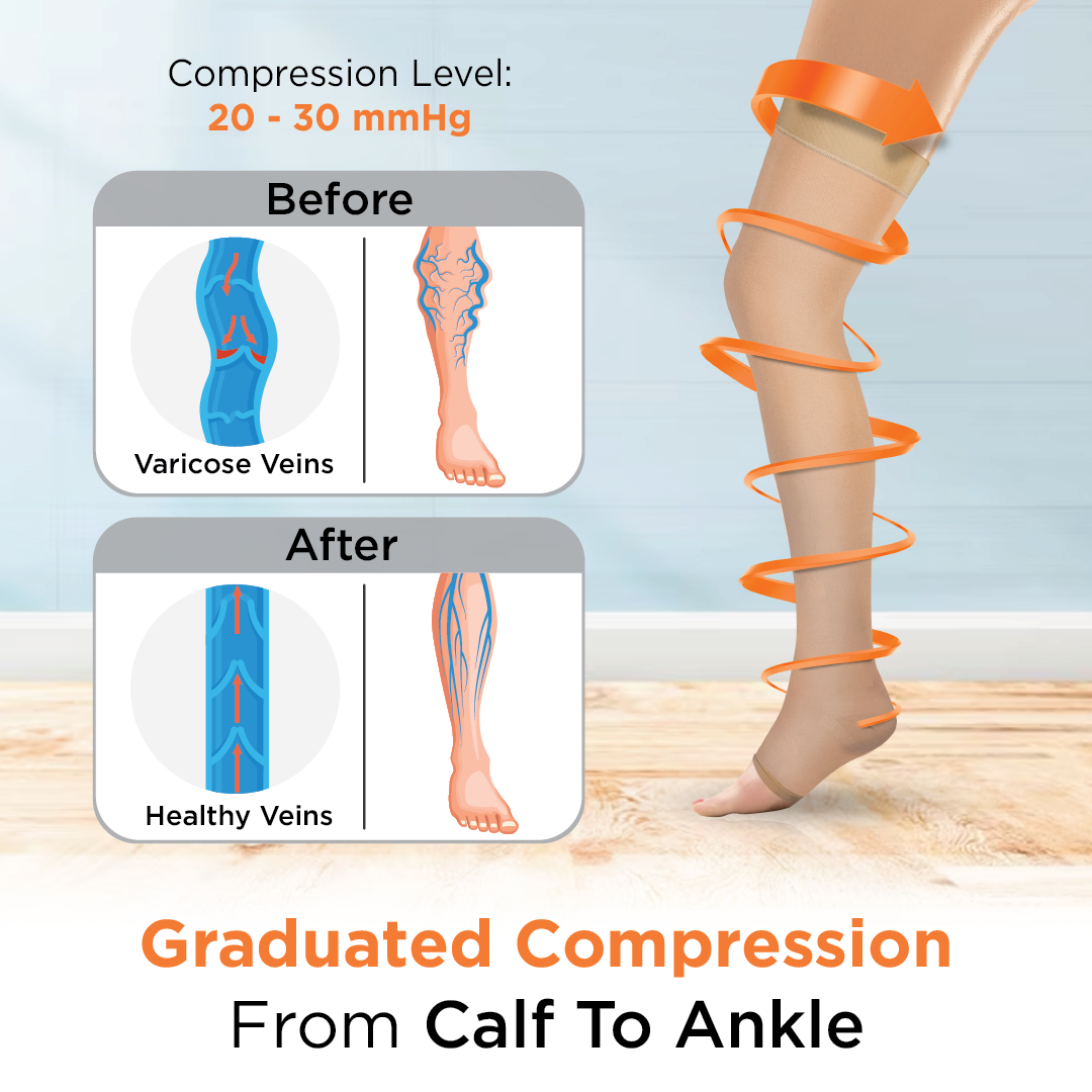 These medical compression stockings provide graduated compression from the ankle to the thigh. It helps to improve blood flow and prevent varicose veins. It is lightweight and comfortable to wear. It provides graduated compression with maximum compression at the ankle, decreasing towards the thigh. It helps to maintain blood flow and reduce discomfort and swelling. It helps in the prevention of Varicose Veins in advanced stages.