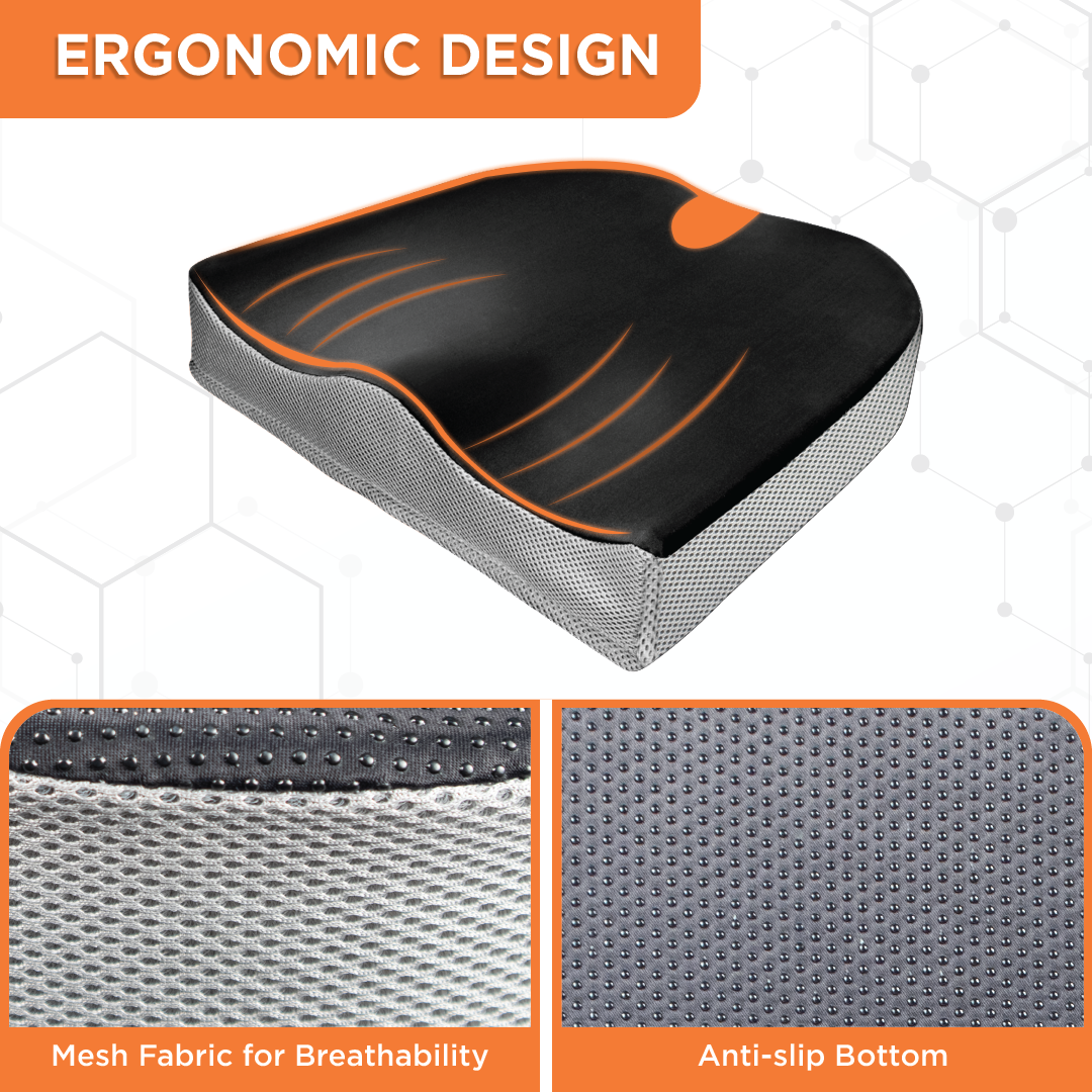 • The coccyx seat cushion undergoes a special finishing process to make the material last longer and add anti-bacterial and antifungal properties.